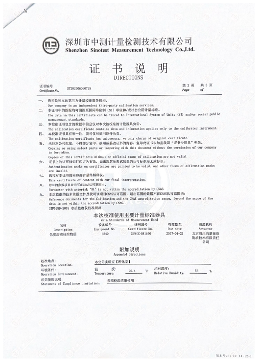 深圳市中測計量檢測技術(shù)有限公司(CNAS認可編號:L16333)于2025年6月18日出具校準證書(ST202506060729),確認送檢設備TS4020液體色度儀(序列號44000181)性能指標符合JJF1689-2018《水質(zhì)色度儀校準規(guī)范》要求。