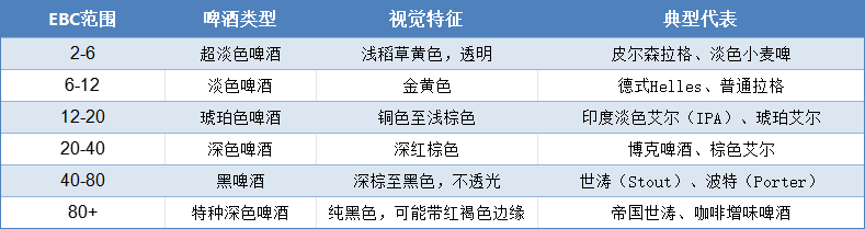 以下是啤酒色度 EBC(European Brewery Convention)標準值 的詳細分類及對應啤酒類型的專業解析,附參考圖表和測量注意事項: