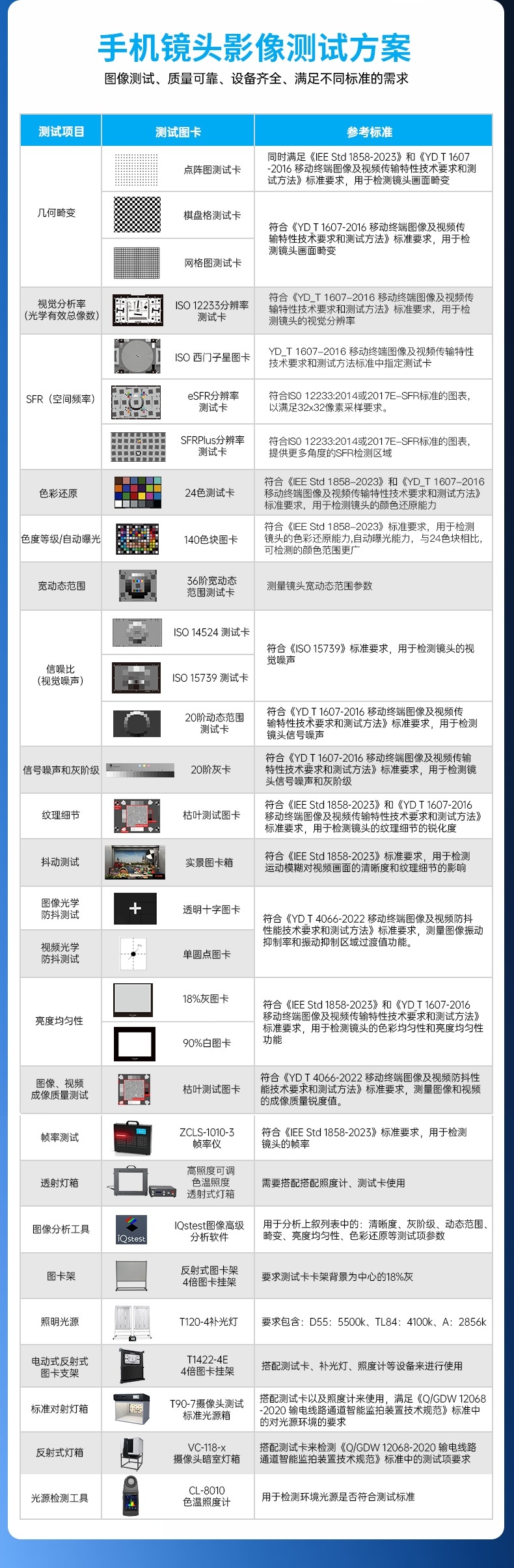 手機攝像頭作為現(xiàn)代智能手機的核心功能模塊,其性能表現(xiàn)直接影響用戶體驗。本文將系統(tǒng)介紹手機攝像頭的測試方案與行業(yè)標準,涵蓋光學(xué)性能、電氣安全、環(huán)境適應(yīng)性等關(guān)鍵測試項目,以及國內(nèi)外主流標準體系,為手機制造商、檢測機構(gòu)和消費者提供全面的技術(shù)參考。