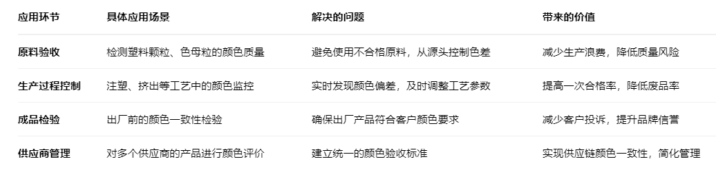 三恩時(shí)塑膠色差儀在塑料行業(yè)產(chǎn)業(yè)鏈各環(huán)節(jié)都發(fā)揮著重要作用,其具體應(yīng)用價(jià)值如下表所示: