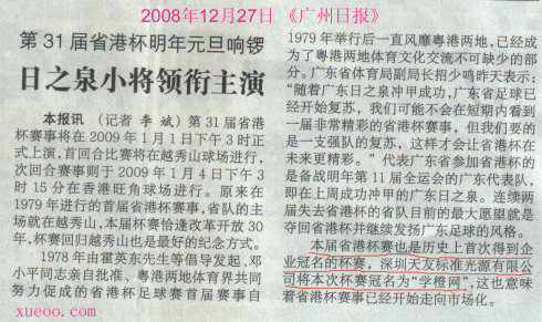 1978年12月,廣東省足球協會與香港足球總會關于“省港杯”足球賽協議書的簽署,走出了“改革開放”的重要一步。今年是改革開放30周年,省港杯是歷史的見證和傳承、是如小孩盼過年一樣的身邊故事、是連續而不可間斷的體育盛會。