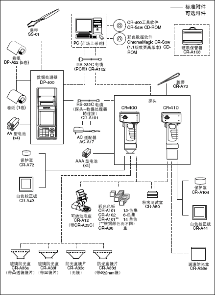 硬盒CR-A103、RS-232C線纜CR-A102(連接PC)、粉體單元CR-A50、CR-400實用軟件CR-S4w、色彩管理軟件SpectraMagic NX CM-S100w、帶玻璃罩的遮光筒CR-A33e |