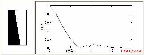 新名詞 SFR!Spatial frequency response (SFR) 主要是用于測量隨著空間頻率的線條增加對單一影像的所造成影響。簡言之SFR就是MFT的精簡版。因為測量MFT需取得昂貴的正弦樣版,并且需換算大量的數據。因此,PIMA開發了這款 較低成本的SFR作為替代品。基本上SFR只需一個雙色調的黑白斜線(如下左圖所示)即可換算出約略相等于MFT的值的解像力評鑒圖。