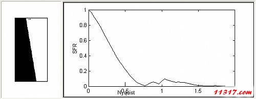 新名詞 SFR!Spatial frequency response (SFR) 主要是用于測量隨著空間頻率的線條增加對單一影像的所造成影響。簡言之SFR就是MFT的精簡版。因為測量MFT需取得昂貴的正弦樣版,并且需換算大量的數據。因此,PIMA開發(fā)了這款 較低成本的SFR作為替代品?;旧蟂FR只需一個雙色調的黑白斜線(如下左圖所示)即可換算出約略相等于MFT的值的解像力評鑒圖。