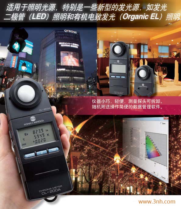 色彩照度計(jì)CL-200A可對光源的三刺激值、色度、色差、相關(guān)色溫、照度(JIS普通型AA級)進(jìn)行測量。CL - 200A是CL - 200的升級版,特別是在測量發(fā)光二極管、有機(jī)發(fā)光二極管(OLED)以及其他形式的有機(jī)電(EL)方面做了提升。