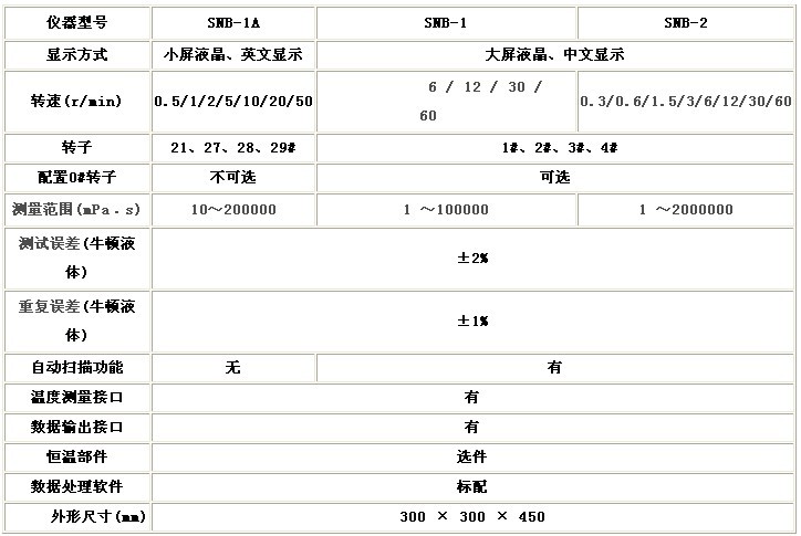 型 號:SNB-1 /SNB-1A/ SNB-2 出廠報價:6500 / 6500/7480 SNB系列的數字式粘度計采用16位微電腦處理器為核心的步進電機高細分驅動技術、程序控制、轉速平穩、操作簡便;液晶背光顯示屏直接顯示粘度、轉速、百分比扭矩、轉子編號以及被測液體的溫度等信息,有出錯報警等功能。采用先進的準確性校準技術,每一檔的準確性、線性全部經過外接計算機用不同粘度的標準硅油進行計量校正。確保了儀器的高精度、高準確性和高重復性。主要特點:①被測試樣的粘度值直接顯示在液晶屏上,無需人工計算;②采用16位微電腦處理器為核心的步進電同高細分驅動、液晶背光顯示;③采用程控電機控制,市電頻率變化不影響測量精度;④整機一機化設計,操作方便;⑤ SNB-1A型專配小樣適配器,用于小劑量樣品。與常用的1~4#轉子需要200~400ml樣品量不同,使用小樣適配器只需20ml的樣品量既可。 詳細技術參數: