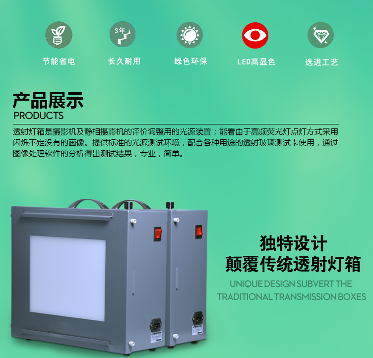 透射燈箱是攝影機及靜像攝影機的評價調整用的光源裝置,提供標準的光源測試環境,配合各種用途的透射型測試卡使用,通過圖像處理軟件的分析得出測試結果,專業、簡單。