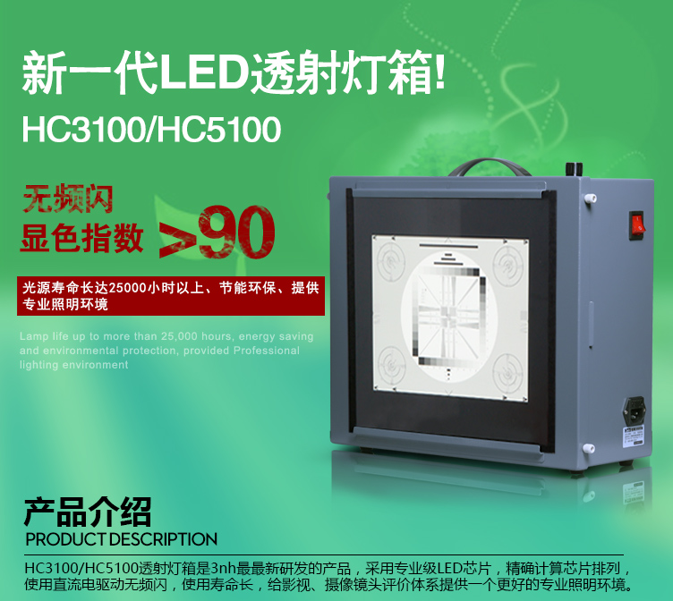 標準透射燈箱HC5100/3100是3nh研發的新款透射燈箱,采用專業級LED芯片,精確計算芯片排列,使用直流電驅動無頻閃,使用壽命長,為影視、攝像鏡頭評價體系提供一個更好的專業照明環境。