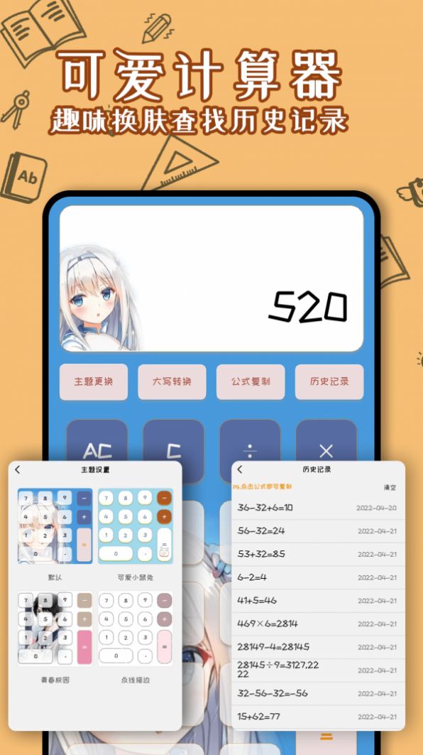 1. 可愛計算器:擁有趣味換膚功能,并可查找歷史記錄。
