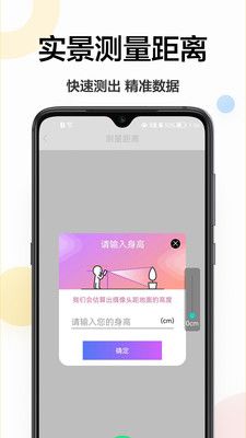 3、為更多用戶帶來便捷的服務,幫助用戶隨時測距。1. 【距離測量】以你的身高作為參照輸入,把靶心依次對準物體底部與頂部進行拍照,瞬間就能測出物體高度,既方便又快捷。此外,你也能測量他人身高。