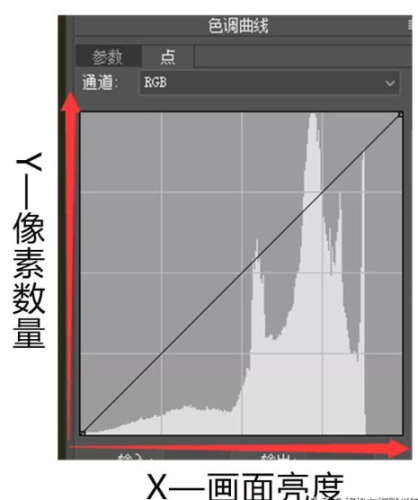 曲線的橫坐標,從左到右分別對應著畫面中的陰影區、中間調和高光區。曲線的縱坐標,則代表像素數量。