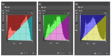 紅、綠、藍每條曲線均可對兩種色彩進行調節。比如向上調整紅曲線會增加紅色,而向下調整紅曲線則會增加青色,也就是紅色的對比色;相似的,調整藍色曲線除了能增加藍色外,還可以增加它的對比色——黃色;而綠色曲線則可以添加綠色和它的對比色——洋紅。
