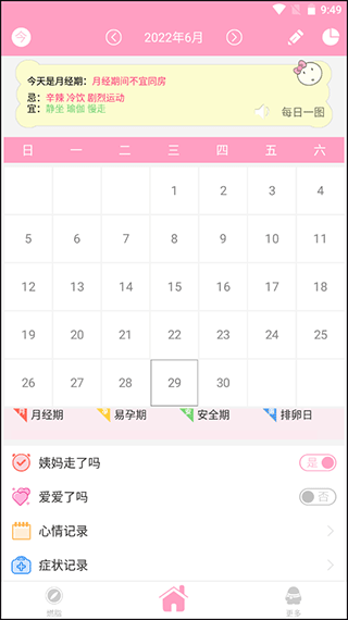 (1)按照綠框提示選中日期29號,然后根據紅框提示打開姨媽走了嗎開關,設置完成后如下圖所示;