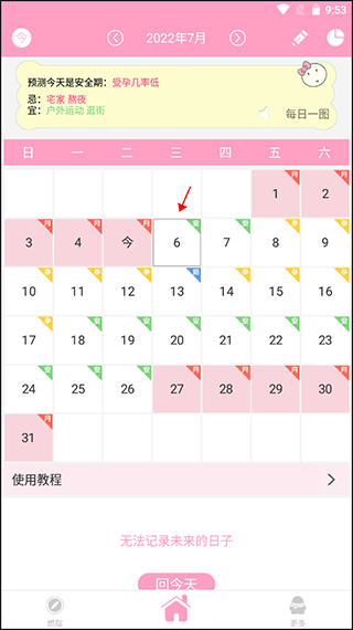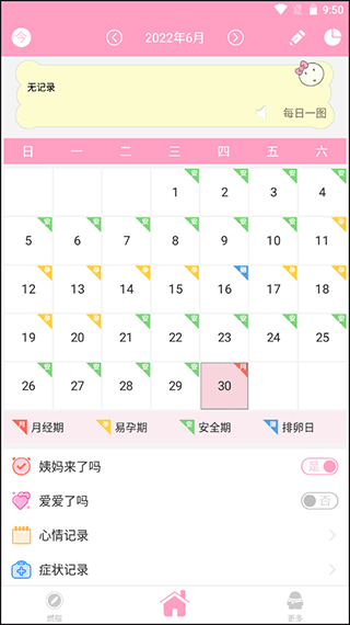 5、在日歷上標注經期日期,并以彩色高亮形式顯示,同時日歷還具備記錄心情日記的功能。