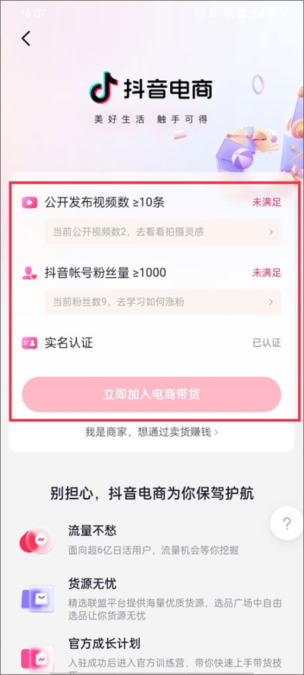 然后實名認證完成入駐抖音電商平臺即可進行帶貨了