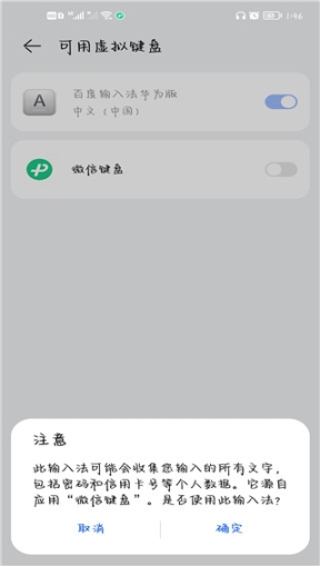 1. 按照提示,優(yōu)先啟用微信鍵盤。如上圖所示,先選擇“啟用”選項,接著切換到微信鍵盤。