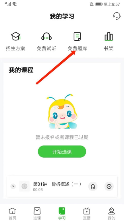 2、進(jìn)入我的學(xué)習(xí)界面,選擇上方“免費(fèi)題庫(kù)”選項(xiàng),