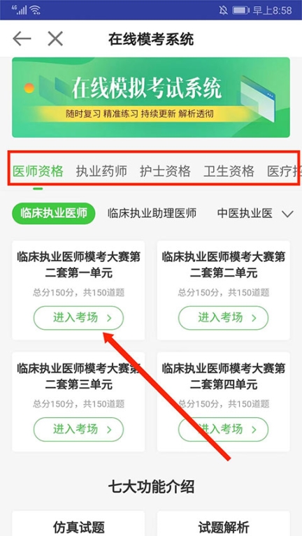 醫(yī)生資格中的“臨床執(zhí)業(yè)醫(yī)師”為例,選擇“進(jìn)入考場(chǎng)”選項(xiàng),
