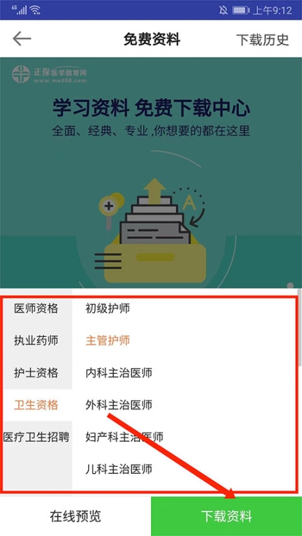 4、彈出對(duì)于科目的分欄,這里以為“衛(wèi)生資格”中的“主管護(hù)師”為例,選擇“下載資料”選項(xiàng),