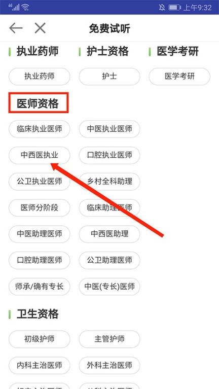 3、選擇需要下載的視頻類(lèi)型,這里以“醫(yī)生資格”中的“中西醫(yī)執(zhí)業(yè)”選項(xiàng)為例,