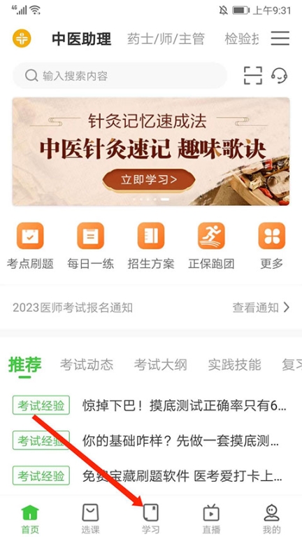 1、打開(kāi)醫(yī)學(xué)教育網(wǎng)app,選擇下方“學(xué)習(xí)”選項(xiàng),
