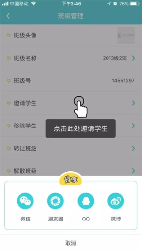 點擊“邀請學生”分享到微信家長群中,邀請學生注冊并加入班級。