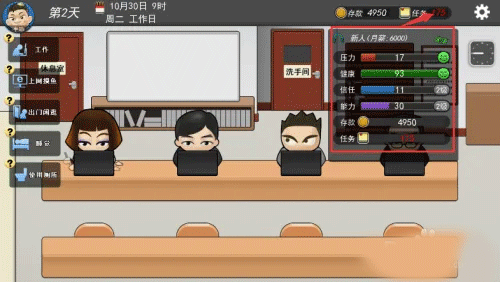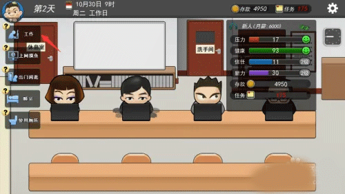 游戲高度還原了職場中大家常遇到的一些事情,并且游戲走向和結局有很多種,可以選擇和不同人搞好關系,可以自己研究各種方法茍過去,比如瘋狂上廁所等等。