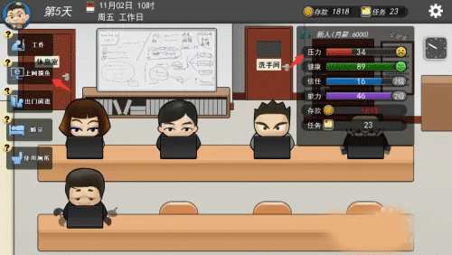 6、點擊出門閑逛可以降低壓力,但是被老板發現會減少信任度。