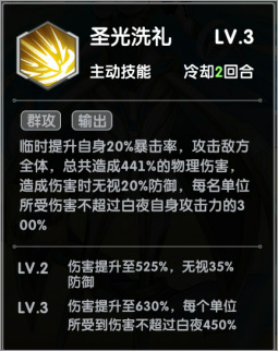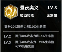 提升白夜的攻擊力與生命值,達到3級將額外提供傷害加成。