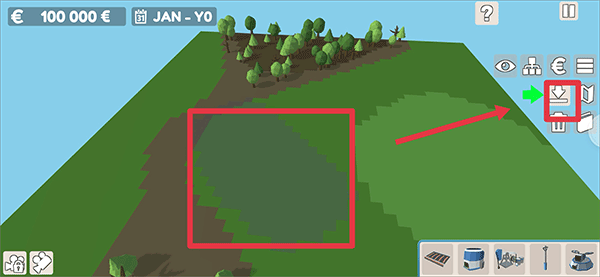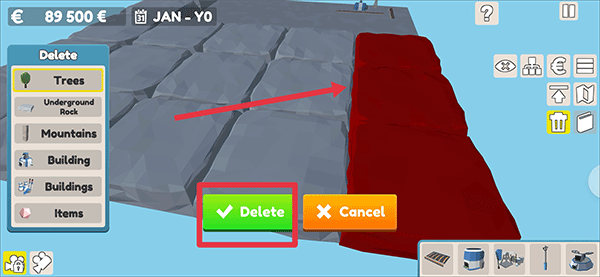 3、點擊地面并拖動它。在釋放觸摸時,選擇框中的每棵樹或石頭都會被選中,然后按下刪除按鈕刪除。