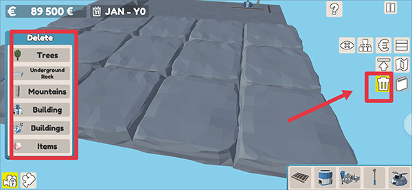 2、每一種礦石和液體都覆蓋著石頭,如何你想開始采礦你需要移除石頭,而要移除石頭或樹木,請點擊垃圾桶按鈕,然后在刪除選擇器中,點擊相應的物體即可刪除它