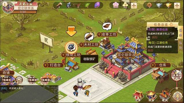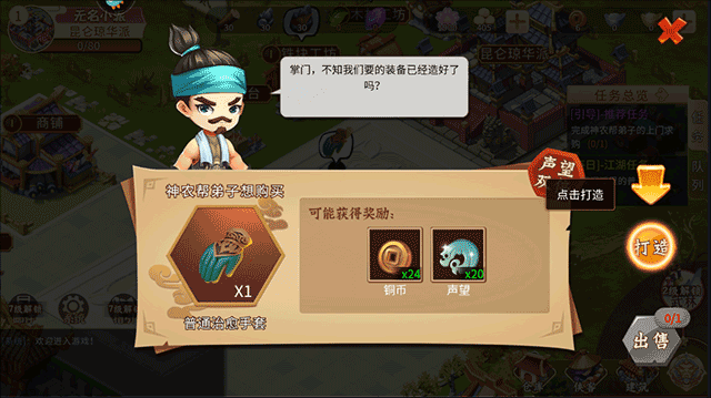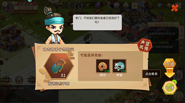 1. 裝備打造:門派擁有多種裝備配方可供研究與打造,可安排門下弟子進行打造工作,打造完成的裝備能在商鋪售賣,借此獲取門派資金。