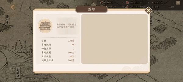 開局產業優先買醫館,醫館是除香料鋪之外所有中型地產中性價比最高的。地產最好買在同一個地區內,有連鎖加成。