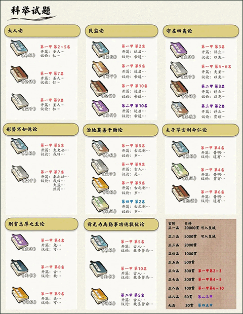 試題都需要四書五經作引論,不然必落榜,所以未有官職前,行動點數都花去太學拿書。(概率看臉)