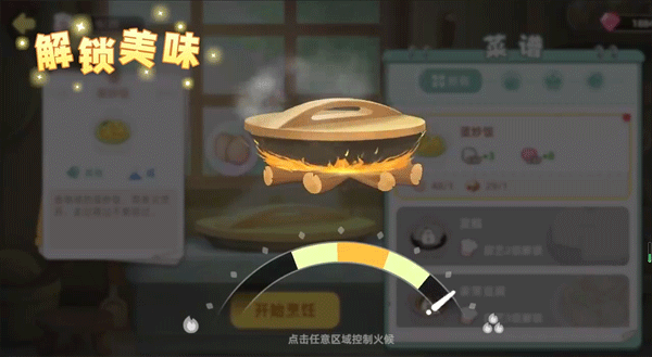 根據菜譜上所需要的材料,研究食譜,并解鎖相應的美味,不過需要注意是,當指針指向橙色區域就可以點擊屏幕完成一道菜了。