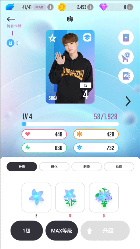 5、兌換。同樣的卡片總有一張以上才可以兌換多余的那張,兌換給卡片相對應的成員進化道具,升級卡牌的花和 DNA 。