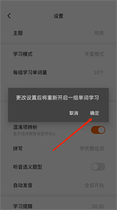 5、出現“更改設置后將開始重新開始一組單詞學習”,選擇“確定”,每天背單詞量就設置成功了。