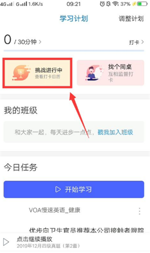 在學習計劃界面中,點擊上方的“聽力挑戰”選項,進入聽力挑戰界面。