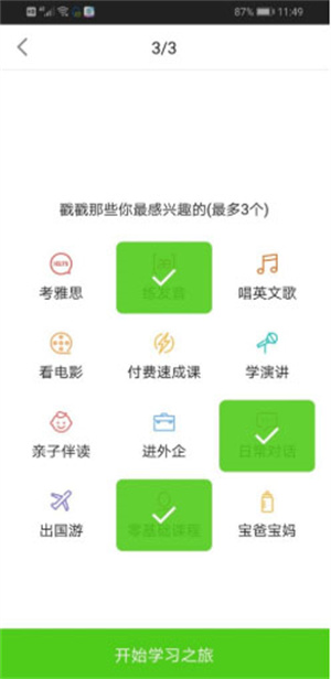 2、選擇課程,點擊【開始學習】,可以進行錄音闖關。