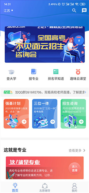 2、在軟件首頁中可以看到查大學、搜專業、排名早知道、趣味云課堂等功能;