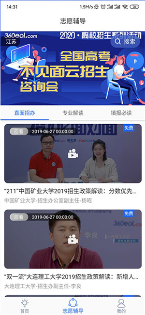 3、在志愿輔導中可以看到直面招辦、專業解讀、填報志愿等咨詢;