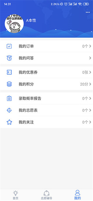 4、在我的中有著我的訂單、我的問答、我的優惠劵、我的積分、錄取概念報告、我的志愿表、我的關注等功能。