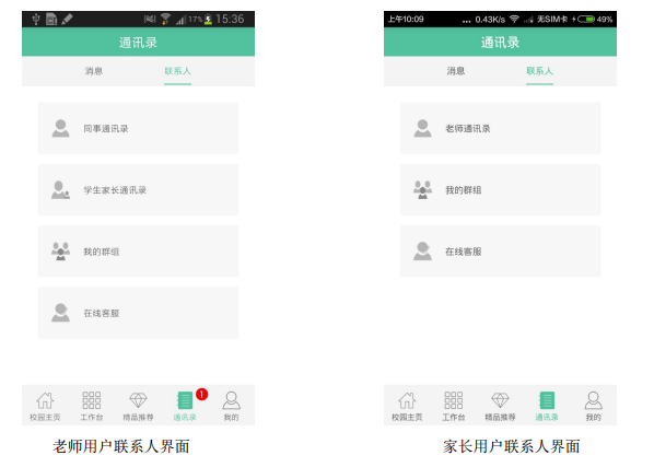 如果是教師用戶,如圖選擇“聯系人”可以看到同事通訊錄、學生家長通訊錄、我的群組以及在線客服。
