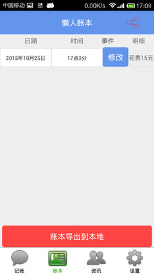 懶人賬本是一款極為好用的記賬應用。該軟件具備十分簡潔的操作界面,用戶能夠在記賬、賬本、資訊、設置等模塊間實現流暢切換。點擊記賬功能,即可新建個人賬本,還能在系統里錄入詳細的花費明細與事件,系統會自動生成日期以及記賬時間。