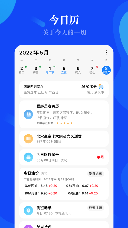 今日歷是一款功能極為強大的生活服務類軟件。通過它,大家能查看當天日期,軟件每日會更新多項內容,像今日油價信息,十分詳細具體。不僅如此,還能自由切換不同城市進行查看,隨時隨地知曉當地城市今日限行尾號。
