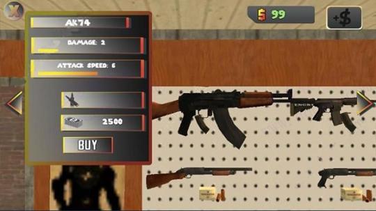 4、會顯示各種武器,通過最左邊和右邊的箭頭來切換武器,每種武器我們可以看到名稱、傷害、攻擊速度,子彈,價格,比如說AK74需要2500美金。