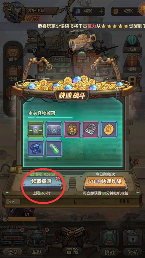 3、如下圖,玩家可以領取掛機資源,掛機時間越長可以得到的獎勵越多