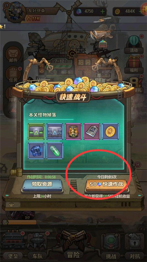 4、接下來我們還可以使用鉆石立即獲得120分鐘掛機收益,每天有三次機會,這樣升級就會更加快速了
