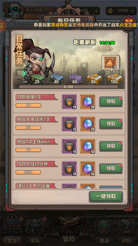 打開任務界面,玩家完成登陸、主線BOSS挑戰、干員招募、車塔試煉等任務后可以一鍵領取獎勵