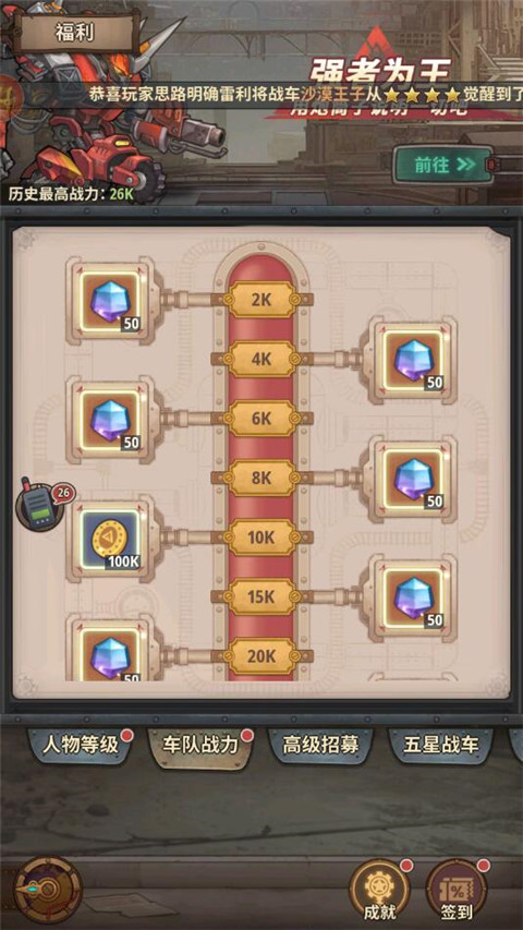 進入到游戲的福利系統,在人物等級、車隊戰力、高級招募等菜單來領取鉆石